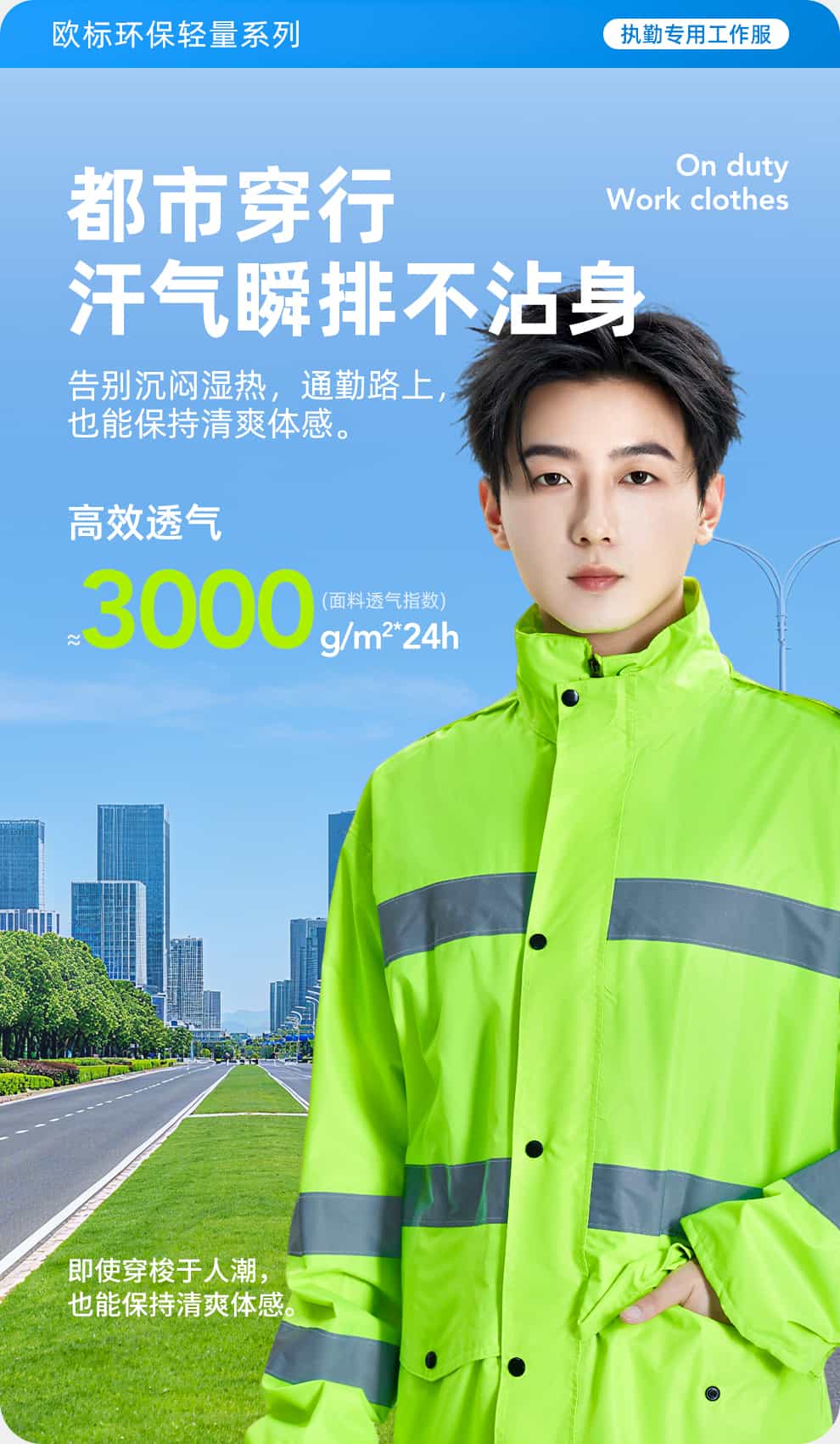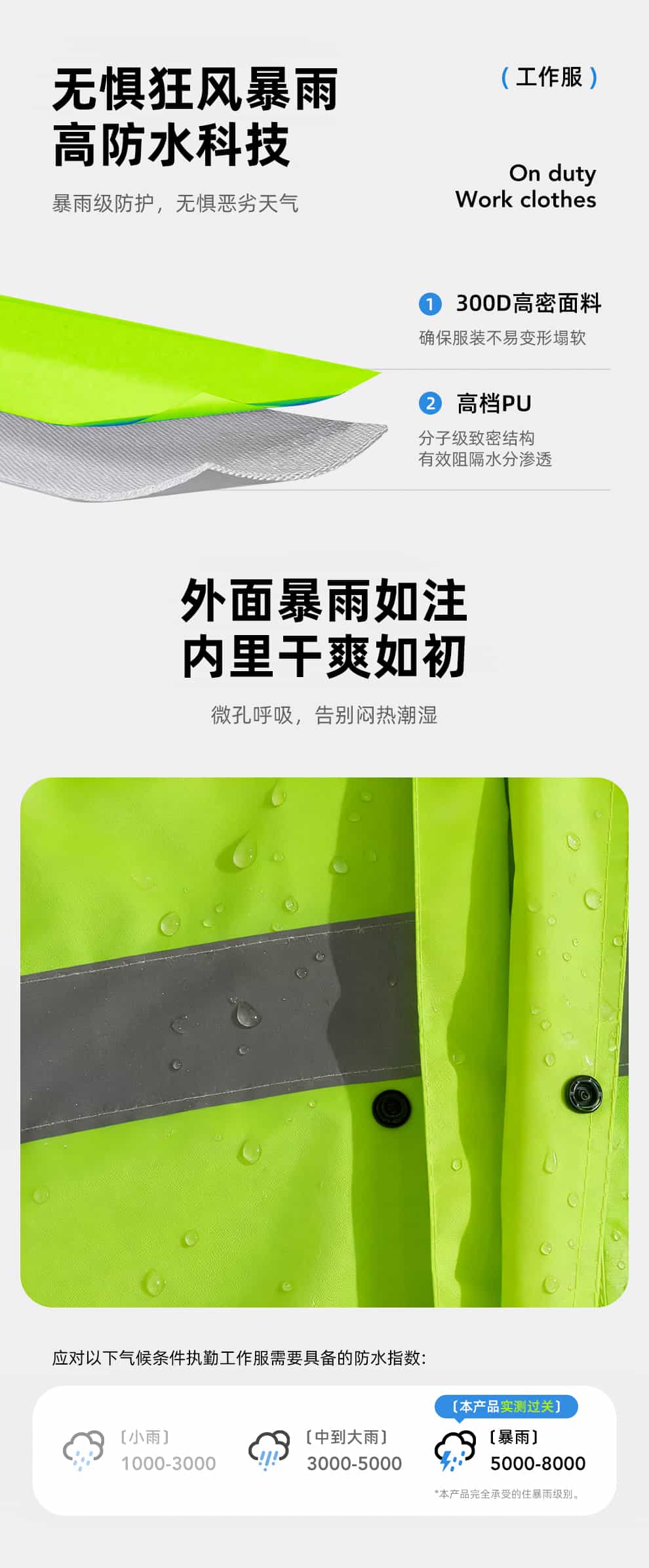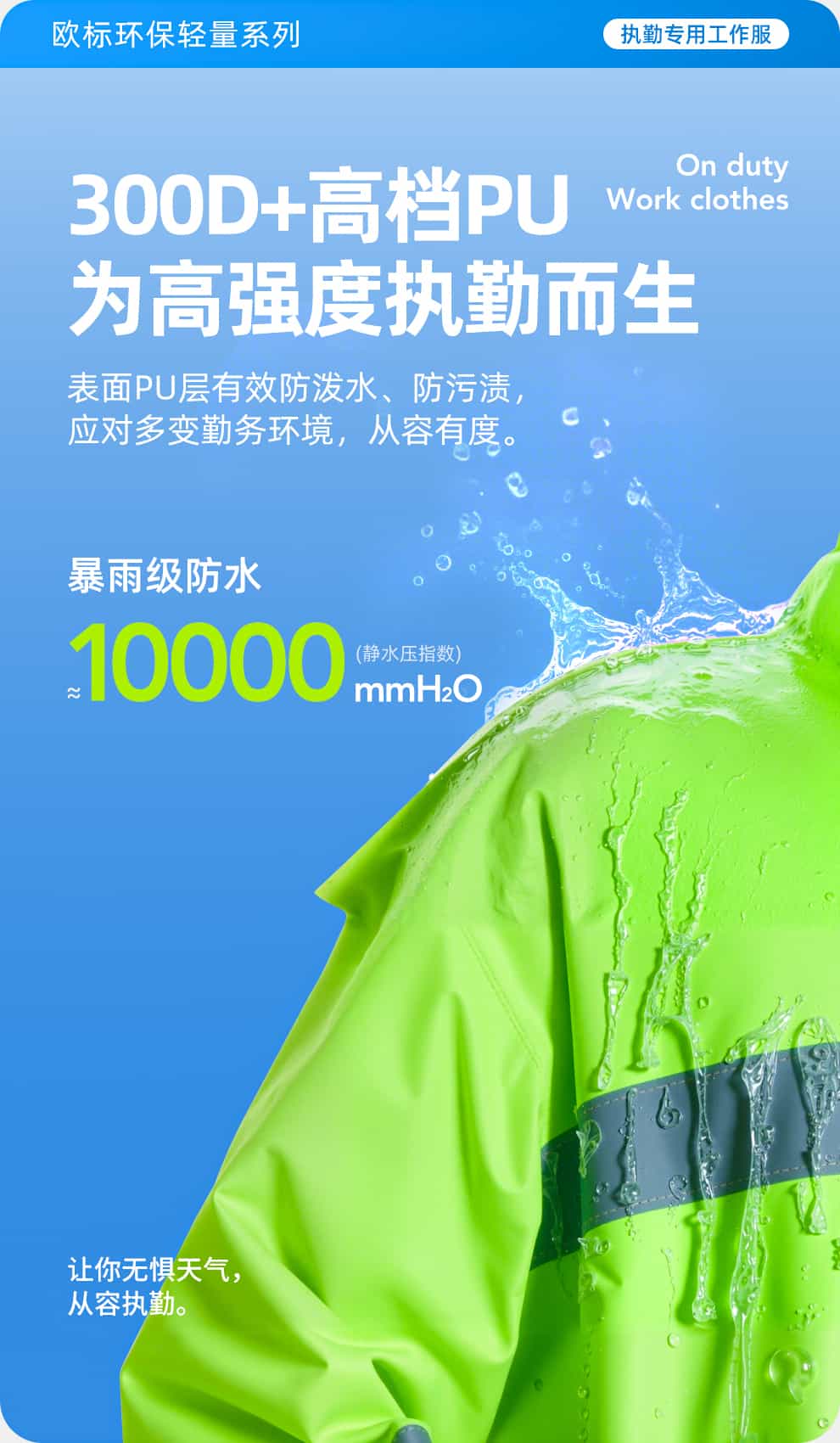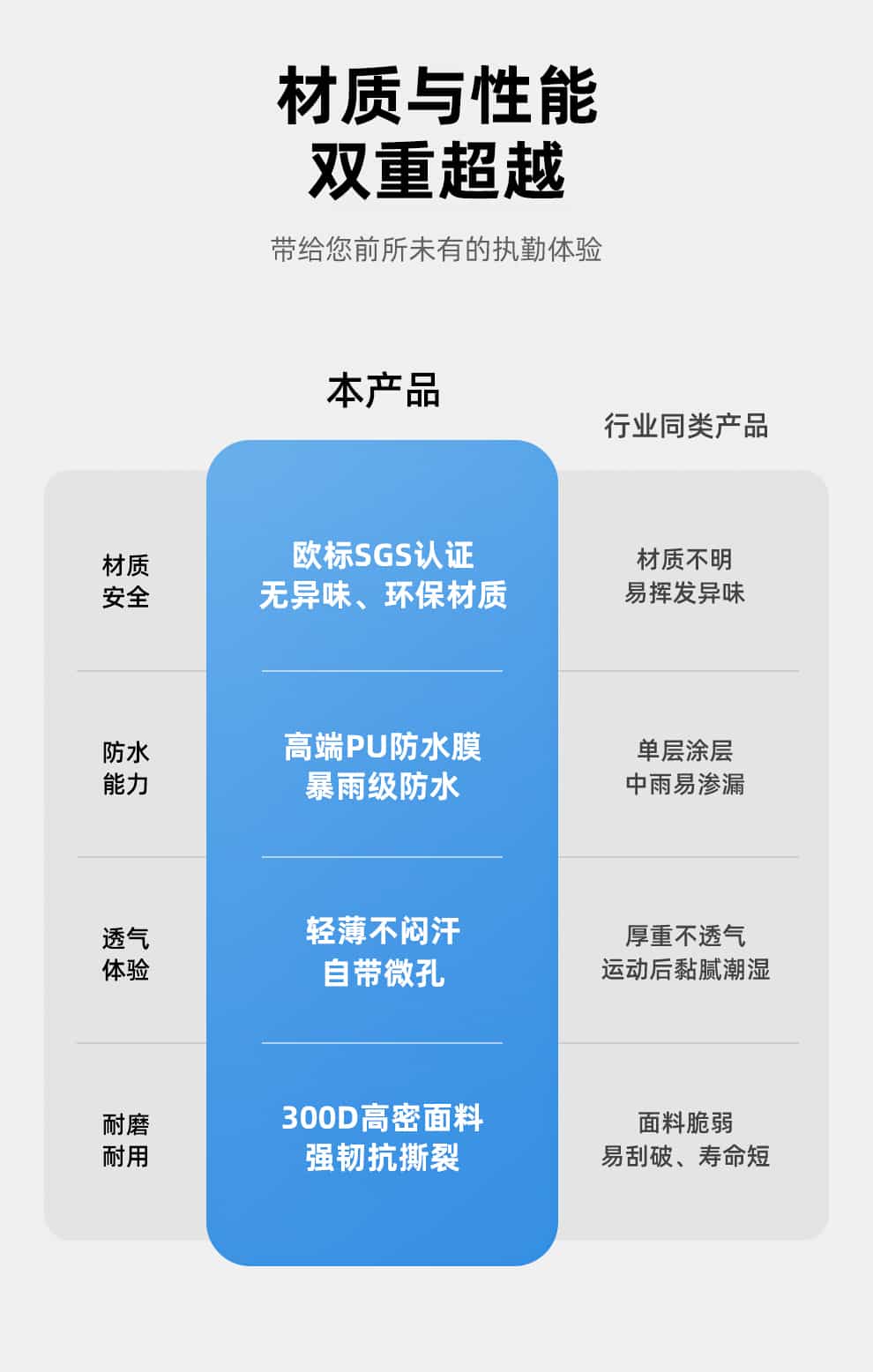 面料:300D 高档PU 防水指数:10000mmH₂O 执行标准:欧标