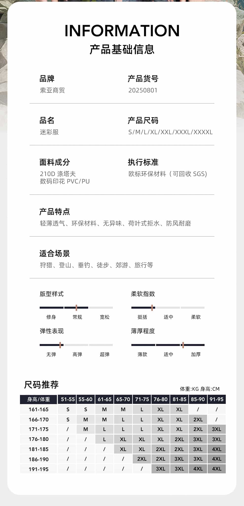 尺寸:XL/XXL/XXXL/XXXXL 颜色:迷彩