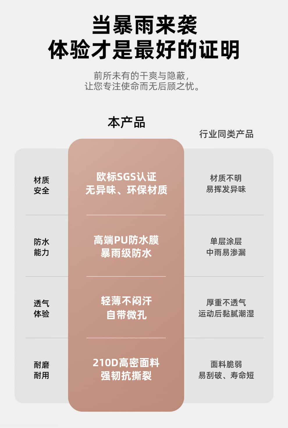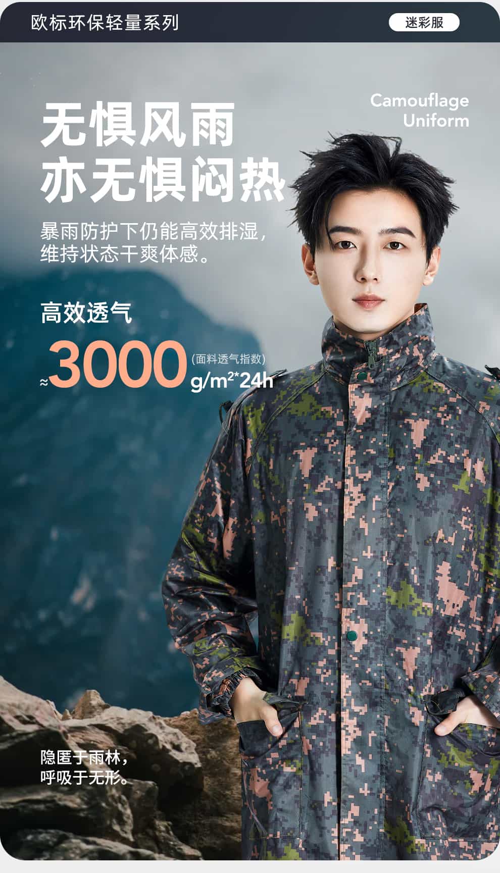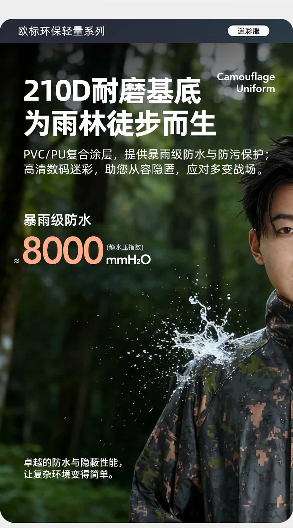 面料:210D 涤塔夫 数码印花 PVC/PU 防水指数:8000mmH₂O 执行标准:欧标